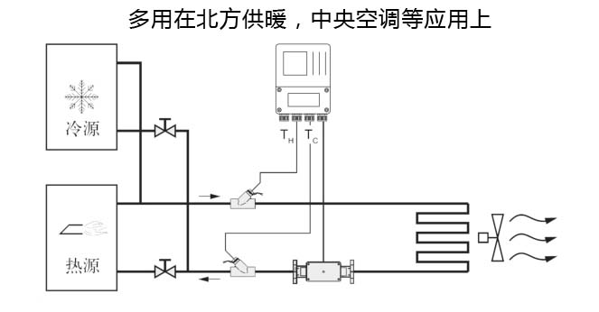 LDGR-SIN電磁熱量表是將一對(duì)溫度傳感器分別安裝在通過(guò)載熱流體的上行管和下行管上,流量計(jì)安裝在流體入口或回流管上(流量計(jì)安裝的位置不同,最終的測(cè)量結(jié)果也不同),流量計(jì)發(fā)出與流量成正比的脈沖信號(hào),一對(duì)溫度傳感器給出表示溫度高低的模擬信號(hào),而積算儀采集來(lái)自流量和溫度傳感器的信號(hào),利用積算公式算出熱交換系統(tǒng)獲得的熱量。