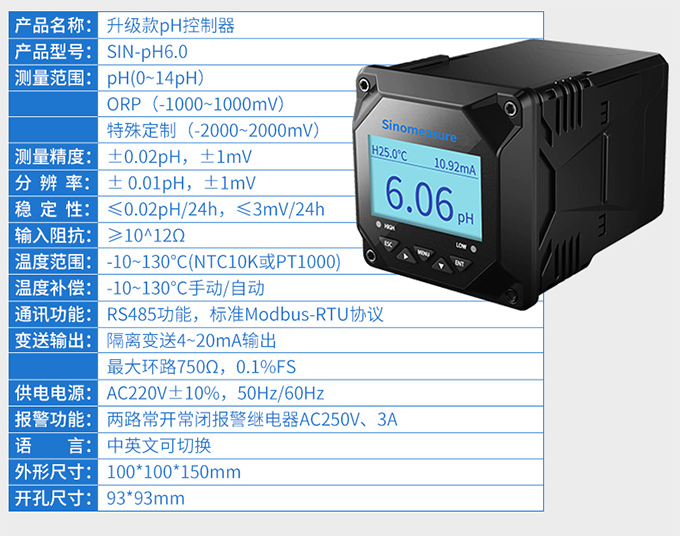 SIN-pH6.0型工業(yè)pH計(jì),是工業(yè)酸度計(jì)的智能化升級(jí)產(chǎn)品。可對(duì)污水pH值進(jìn)行連續(xù)測(cè)量或根據(jù)現(xiàn)場(chǎng)工況進(jìn)行定量控制,來(lái)選擇相應(yīng)的PH電極以有效提高產(chǎn)品的測(cè)量精度和延長(zhǎng)產(chǎn)品的壽命。